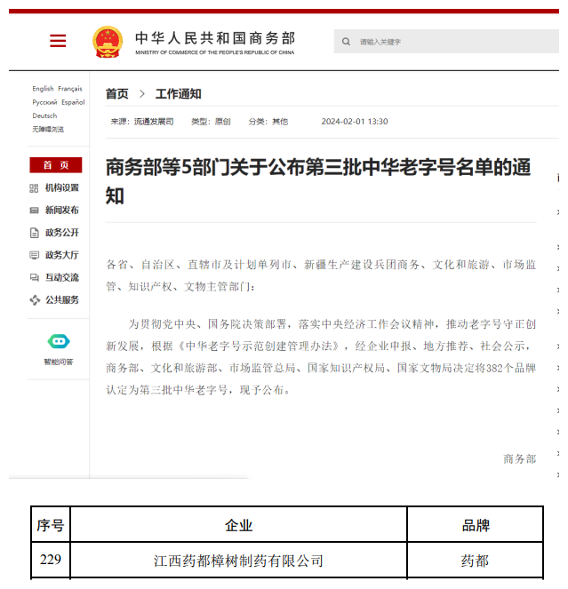 2024年2月1日下午,由商務部、文化和旅游部、市場監(jiān)管總局、國家知識產(chǎn)權局、國家文物局五部門聯(lián)合發(fā)文公布了382個品牌認定為第三批中華老字號。仁和集團旗下“藥都”品牌位列其中。據(jù)悉,此次江西共認定13個中華老字號,“藥都”是唯一一個江西省醫(yī)藥品牌中華老字號。