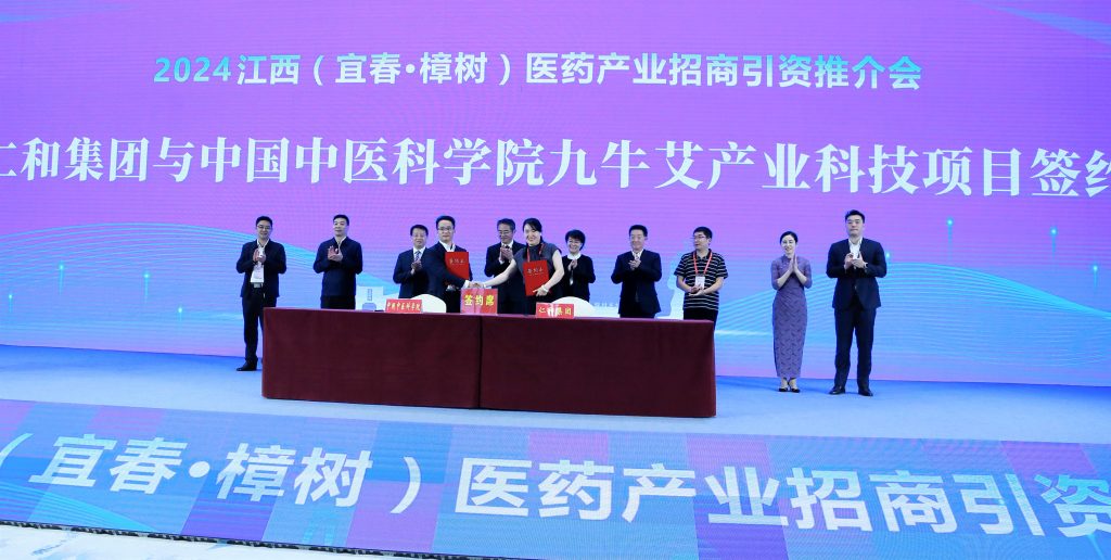 10月16 日下午,楊總前往樟樹市溫德姆酒店,參加由江西省商務(wù)廳、宜春市人民政府主辦,宜春市商務(wù)局、樟樹市人民政府共同承辦的 2024 江西(宜春?樟樹)醫(yī)藥產(chǎn)業(yè)招商引資推介會,楊瀟總及黃武軍董事、李欣董事陪同。會上,仁和集團(tuán)與中國中醫(yī)科學(xué)院就 “九牛艾產(chǎn)業(yè)科技” 項(xiàng)目進(jìn)行簽約,借助中國中醫(yī)科學(xué)院科研實(shí)力,進(jìn)一步提升中醫(yī)藥領(lǐng)域的研發(fā)水平和核心競爭力。楊總表示,未來雙方將整合優(yōu)勢資源,在科研創(chuàng)新、產(chǎn)業(yè)應(yīng)用等方面展開深度協(xié)作,為推動樟樹醫(yī)藥產(chǎn)業(yè)邁向更高層級注入強(qiáng)大動力。
