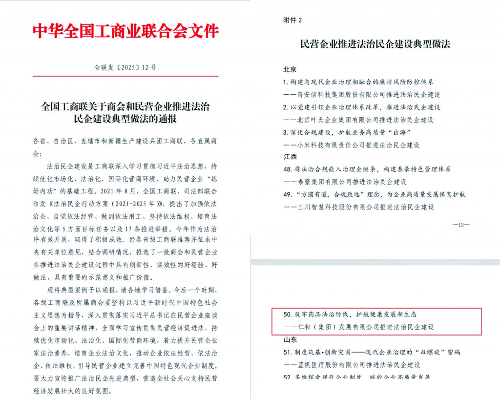 近日,全國工商聯(lián)下發(fā)《關(guān)于商會和民營企業(yè)推進法治民企建設(shè)典型做法的通報》,仁和集團憑借 “筑牢藥品法治防線,護航健康發(fā)展新生態(tài)” 的創(chuàng)新實踐,成功入選法治民企建設(shè)典型案例。作為江西省藥品行業(yè)唯一入選企業(yè),集團系統(tǒng)性法治建設(shè)經(jīng)驗被列為國家級可復(fù)制推廣范例,彰顯了民營企業(yè)在《民營企業(yè)促進法》指引下,以法治促發(fā)展的積極作為。